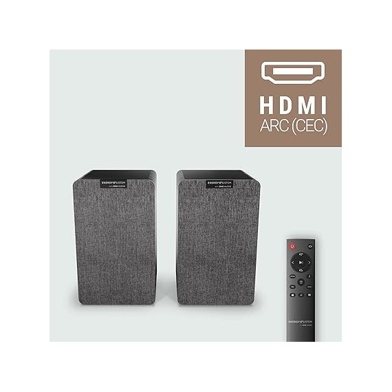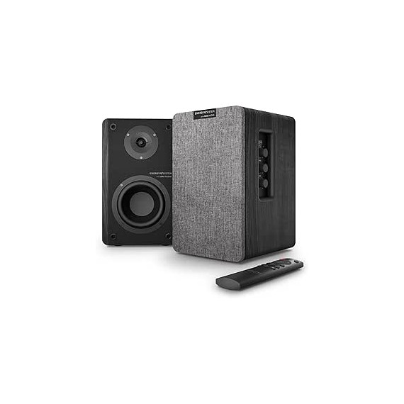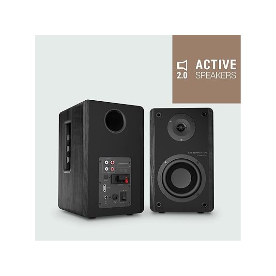 Jeu de 2 enceintes actives Energy Sistem de bibliothèque 2.0, DSP avec différents modes d’égalisation, double entrée RCA, Bluetooth 5.0, entrée optique TOSLINK, entrée HDMI CEC, réglage des graves, des aigus et du volume sur le côté, structure en MDF et télécommande.